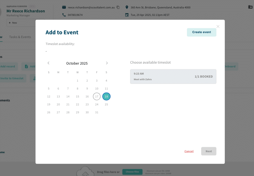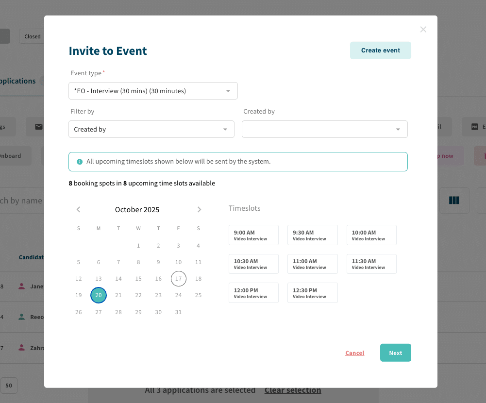 - Improved Scheduling Flow: Invite candidates to events or timeslots seamlessly, with a clear view of availability and new event creation options.
