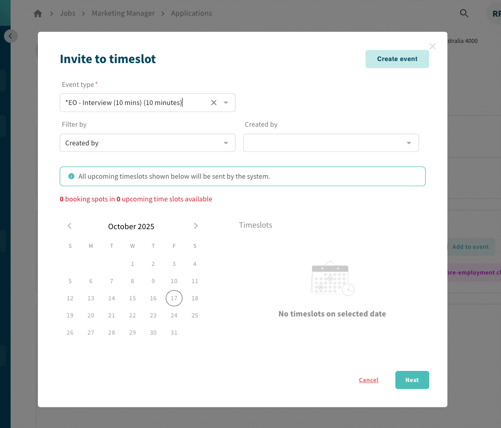 - Smart Filtering: Filter timeslots by recruiter, creator, or job to ensure candidates are assigned to the right event every time.